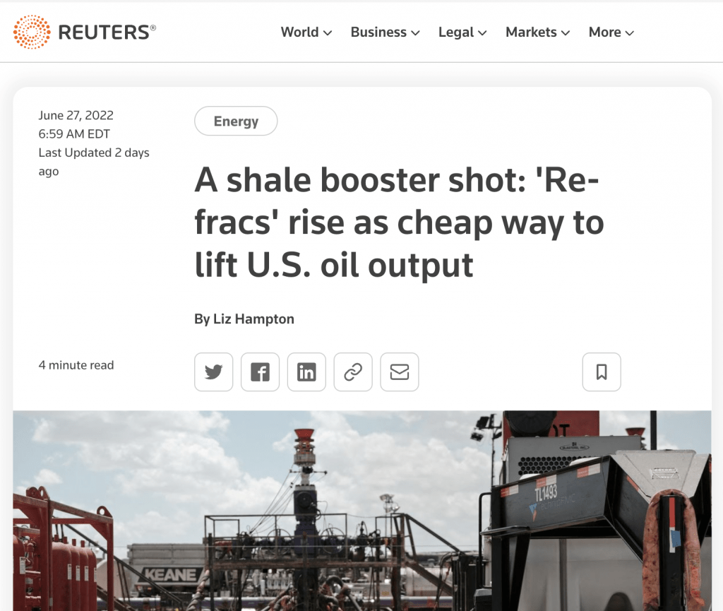 June 27 (Reuters) – U.S. shale oil producers are returning to existing wells and giving them a second, high-pressure blast to lift output for a fraction of the cost of finishing a new well. These “re-fracs” are taking hold as shale oil producers look to take advantage of $100 a barrel crude without making big investments in new wells and fields.