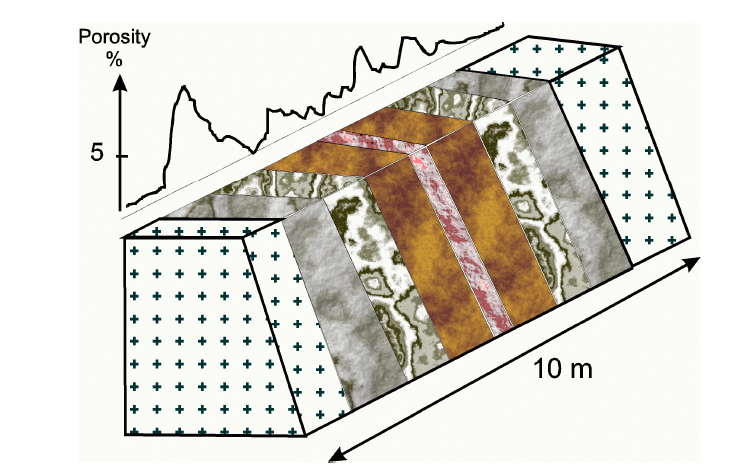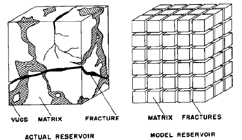 Dual porosity models keep track of ‘average’ fracture properties in a region of rock, rather than trying to represent each individual fracture. Dual porosity models track the overall amount of fluid in fracture pore volume and in matrix pore volume. This approach, pioneered by Warren and Root (1963) has been used ubiquitously in reservoir engineering for many decades.