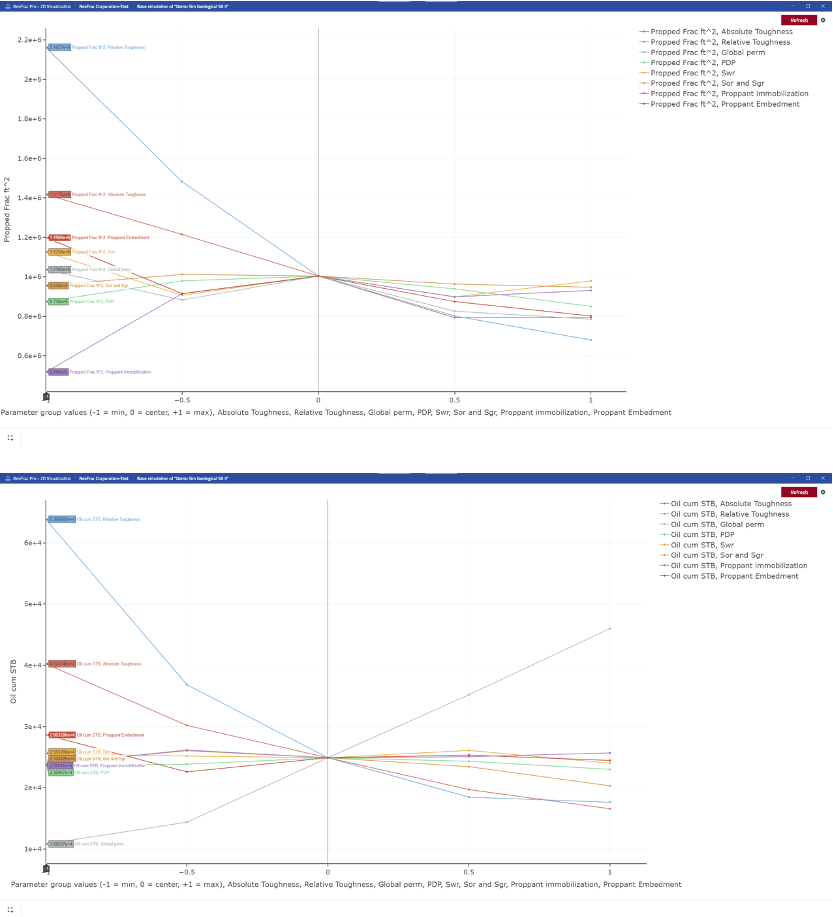 ResFrac’s sensitivity analysis tools address these needs by introducing a new type of workflow in the ResFracPro user interface specifically designed for sensitivity analysis. Starting from an existing manually created simulation, the user selects a set of parameters to vary, and specifies how to vary them to create a collection of related simulations. With a single click these simulations can be sent to the ResFrac cloud service to run concurrently, and have results automatically download to local storage. The ResFracPro UI also includes new plotting features that help to interpret the results of the batch of simulations, enabling the user to visualize patterns in results across dozens of simulations.