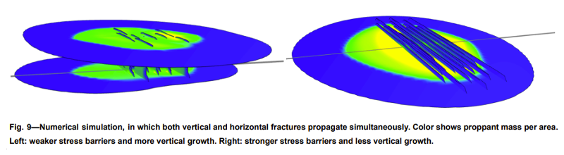 Conventionally, we might expect horizontal or subhorizontal fractures to only form in reverse faulting regimes, when the minimum principal stress is vertical. However, these fractures can also form normal and strike-slip faulting regimes because the stress shadowing from vertical fractures increases the horizontal stresses more than the vertical stresses. Eventually, sufficient horizontal stress can build up such that the fluid pressure exceeds the overburden.