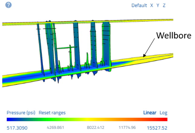 Another important finding of the sensitivity is that the optimal result (55 bbl/ft) still exhibits extensive horizontal fractures because between 25 and 55 bbl/ft the extent of vertical and horizontal fractures were both growing. The 55 bbl/ft scenario would likely increase geomechanical risks, which would need to be evaluated in the context of the particular setting, but production is not maximized by minimizing horizontal fractures. This is an important point as there are reservoir targets where it may be impossible to not initiate horizontal fractures during stimulations, but that should not exclude those targets from consideration.