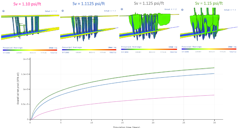The figure below shows results of simulations for different values of Sv gradient. The top pictures show the resulting fracture geometry, while the bottom picture depicts oil production. Note that line colors correspond to different vertical stresses, as is also indicated on the top pictures.