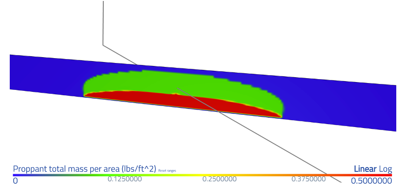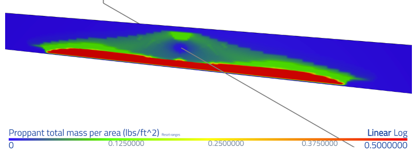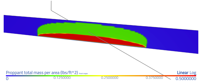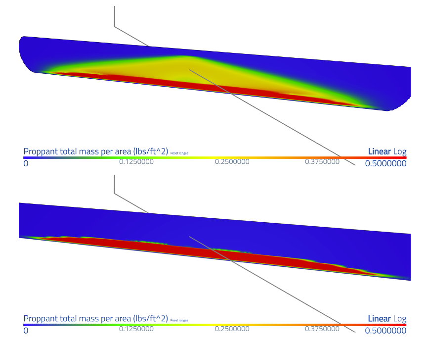 The simulation image shows a relatively uniform distribution of proppant placement in the ‘trapped’ region above the bed. However, this is an artifact of model scale. In reality, we believe the distribution of proppant is irregular. The simulation shows the average concentration, combining both the propped and unpropped patches.