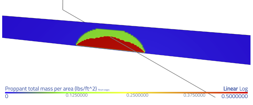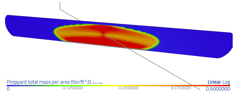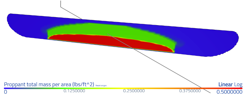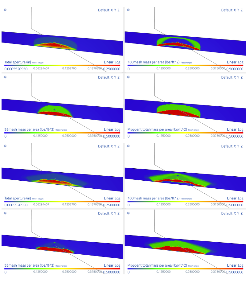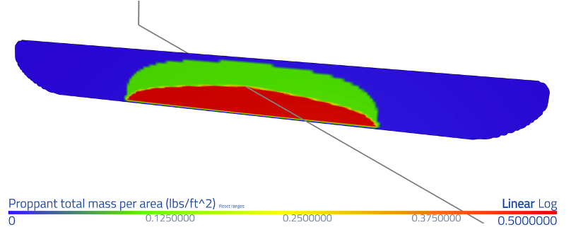 In the figures, the color bar maximum is set to 0.5 lbs of proppant per ft^2 lbs. Elements with proppant placement greater than 0.5 lbs/ft^2 are plotted red, since the color range saturates.