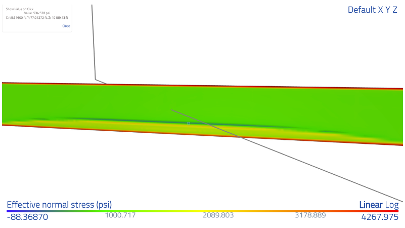 It has sometimes been hypothesized that there may be a small ‘arch’ region above the fracture ‘bed’ (Warpinski, 2009). This arch region can be simulated in ResFrac if you use a sufficiently refined mesh. For example, the image below shows the ‘effective normal stress’ along the fracture from the ‘no trapping’ simulation, zoomed-in on the bed region. We can see that there is especially high stress along the top of the bed, with especially low stress above it. This image is showing the mechanical effect creates the ‘arch’ region. In the simulation, the effective normal stress in the ‘low stress’ region is no lower than about 500 psi. Thus, it remains ‘mechanically closed.’ However, if we had a more refined mesh, we would likely see a region reaching zero effective stress and mechanical opening (this simulation is using 12 ft element height).